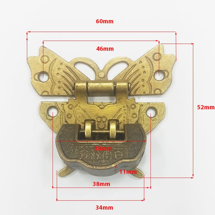 - Bộ khóa hộp bách niên có chìa, chất liệu hợp kim mạ đồng mầu vàng tối. Khóa phù hợp với các sản phẩm hộp gỗ mang phong cách giả cổ, sang trọng.