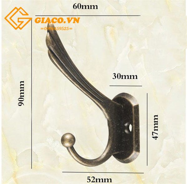 Kích thươc 60x90mm, phù hợp để treo quần áo và túi sách, được làm tư hợp kim mạ màu đồng tối.